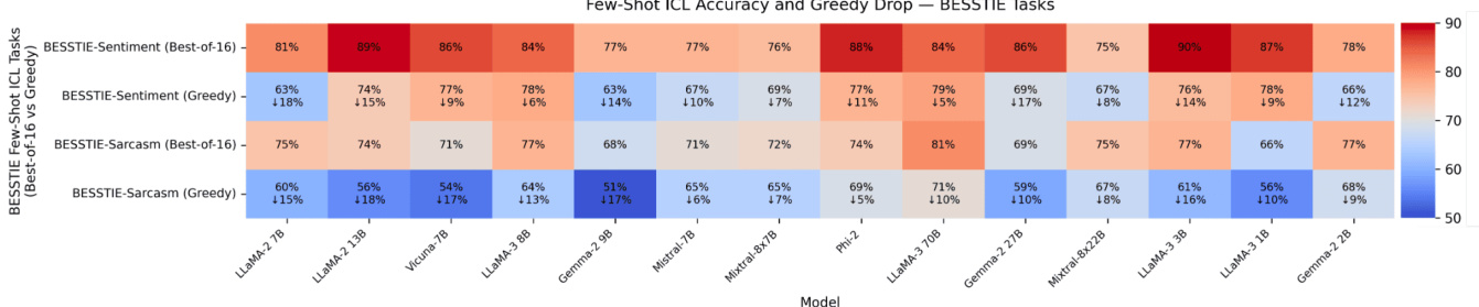 - In few-shot ICL (BESSTIE), best-of-16 decoding increases accuracy by 8–22 points over greedy decoding, with models like Phi-2 and LLaMA-2 13B showing gains >15 points, revealing hidden reasoning ability.
