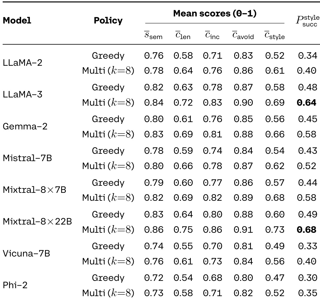 The authors use the table to compare the performance of different models under greedy and multi-sample decoding policies on an instruction-following task. Results show that multi-sample decoding consistently improves performance across all models, with the largest gains observed in the style success rate, which increases from 0.34 to 0.64 for LLaMA-3 and from 0.30 to 0.68 for Mixtral-8×22B. This indicates that the models' ability to follow instructions is significantly underrepresented by greedy decoding, and that a substantial fraction of instruction-compliant trajectories is only revealed through distributional exploration.