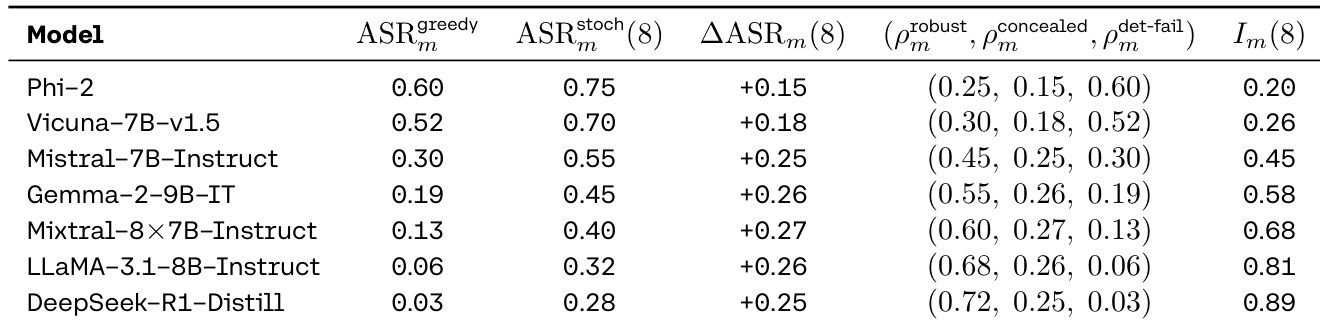 - Safety evaluations show deterministic assessment creates an illusion of robustness: models with low greedy ASR (e.g., LLaMA-3 70B) exhibit high stochastic ASR (up to 30%) and concealed risk, with illusion indices >0.8, revealing that harmful tails are invisible under greedy evaluation.