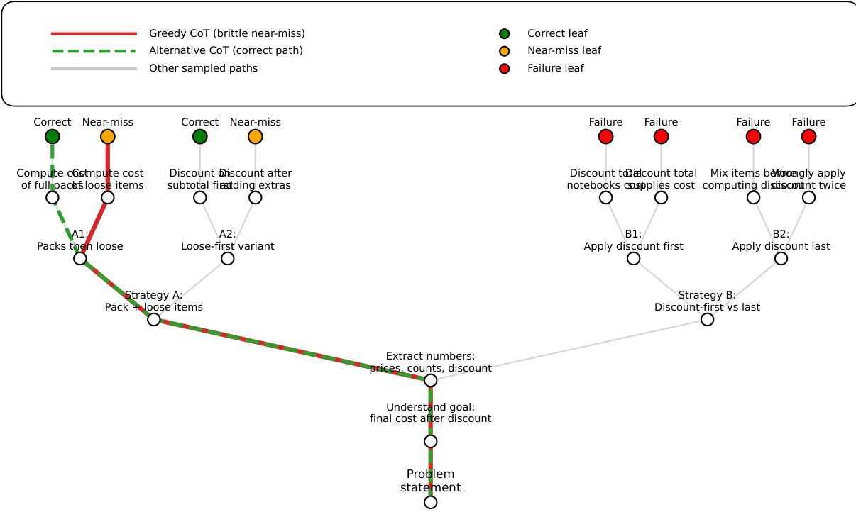 The authors leverage a multi-step reasoning framework to analyze how deterministic inference collapses diverse reasoning paths into a single, brittle trace. This approach constructs a reasoning graph for each problem instance by aggregating multiple sampled chains of thought into a directed acyclic graph (DAG). Each node in the graph represents a reasoning prefix, defined as a sequence of steps from the initial problem statement to a partial solution. Prefixes are considered equivalent if their step embeddings, derived from a sentence encoder, exhibit high cosine similarity, allowing the model to merge semantically similar partial paths. The graph is built by processing each sampled chain sequentially, creating new nodes for unique prefixes and connecting them via directed edges to form paths from the root (empty prefix) to leaves (complete chains of thought). Leaves are labeled as correct, near-miss, or failure based on the final answer and logical consistency of intermediate steps. The greedy decoding path is identified as a specific root-to-leaf trajectory within this graph, representing the single path selected by the deterministic policy. This framework enables the quantification of reasoning diversity and the identification of "collapsed failures," where correct strategies exist in the sampled graph but are systematically pruned by greedy inference.