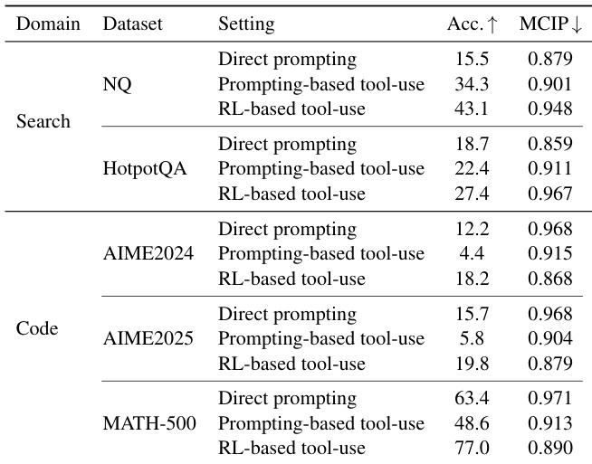 The authors use Qwen2.5-3B-Instruct to evaluate three tool-use configurations—direct prompting, prompting-based tool-use, and RL-based tool-use—across evidence (Web Search) and verification (Code Interpreter) domains. Results show that in the search domain, tool use increases overconfidence, with RL-based tool-use achieving the highest accuracy but also the highest MCIP, while in the code domain, tool use reduces overconfidence, with RL-based tool-use achieving the lowest MCIP and highest accuracy.