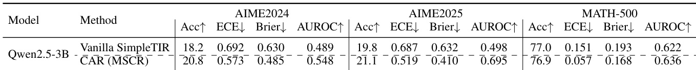 The authors use Qwen2.5-3B-Instruct to evaluate tool-integrated reasoning with a Code Interpreter, comparing Vanilla SimpleTIR against their CAR (MSCR) method across AIME2024/2025 and MATH-500 benchmarks. Results show that CAR significantly improves calibration, reducing ECE and Brier scores while increasing AUROC, though absolute calibration remains lower than in pure reasoning models and is more challenging on complex problems.