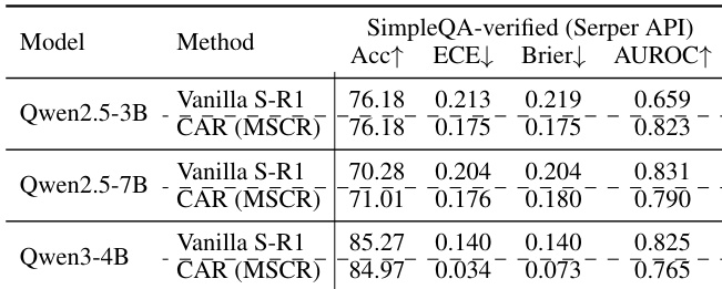 - Calibration gains from CAR transferred robustly to real-world API environments (Serper API), with CAR (MSCR) outperforming vanilla Search-R1 in calibration and accuracy.