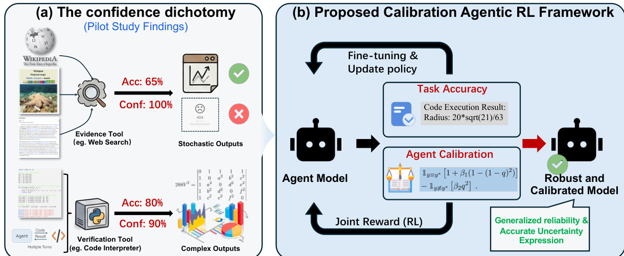 The authors from the University of Tokyo, RIKEN AIP, Northwestern University, Waseda University, and Carnegie Mellon University propose a reinforcement learning framework to improve verbalized calibration in tool-integrated LLM agents, addressing a confidence dichotomy between noisy evidence tools and deterministic verification tools, enabling self-aware, trustworthy performance across diverse real-world scenarios.