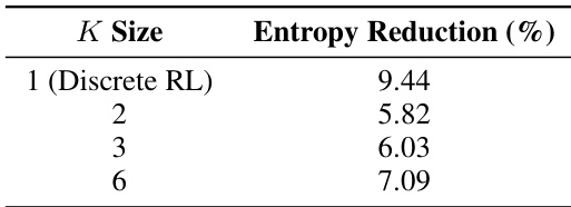 The authors analyze the entropy reduction during training for different multiplex widths, showing that multiplex training with K=2 achieves the lowest entropy reduction of 5.82%, indicating more sustained exploration compared to the discrete RL baseline (K=1) at 9.44%. As the multiplex width increases to K=3 and K=6, the entropy reduction rises to 6.03% and 7.09%, respectively, suggesting that larger widths lead to greater entropy collapse, though still less than the discrete baseline.