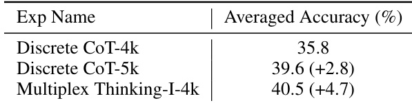 The authors compare the performance of Discrete CoT with different sequence lengths and Multiplex Thinking-I at a fixed 4k token budget. Results show that Multiplex Thinking-I-4k achieves a higher averaged accuracy of 40.5% compared to 39.6% for Discrete CoT-5k, demonstrating that multiplex tokens can achieve better performance with shorter sequences. This indicates that the increased information density of multiplex tokens allows for more efficient reasoning without requiring longer rollouts.