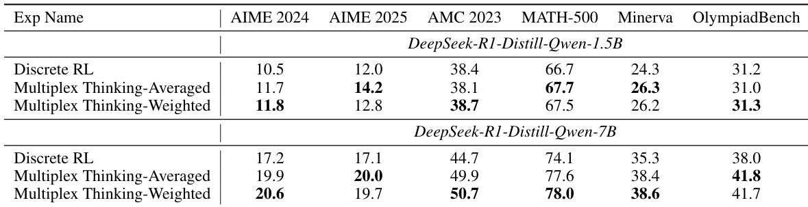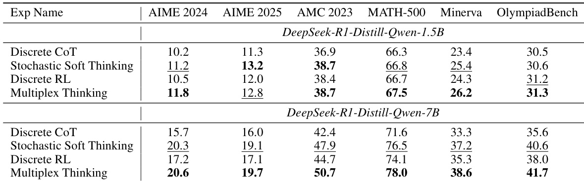 - On six mathematical reasoning benchmarks (AIME 2024, AIME 2025, AMC 2023, MATH-500, Minerva Math, OlympiadBench), Multiplex Thinking achieves the best Pass@1 accuracy in 11 out of 12 settings, surpassing Discrete CoT, Discrete RL, and Stochastic Soft Thinking baselines, with the 7B model showing dominant performance across all tasks.