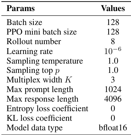 - Hyper-parameters for GRPO training, including learning rate, batch size, and entropy coefficient, are detailed in Table 6 and tuned to optimize convergence and performance across tasks.