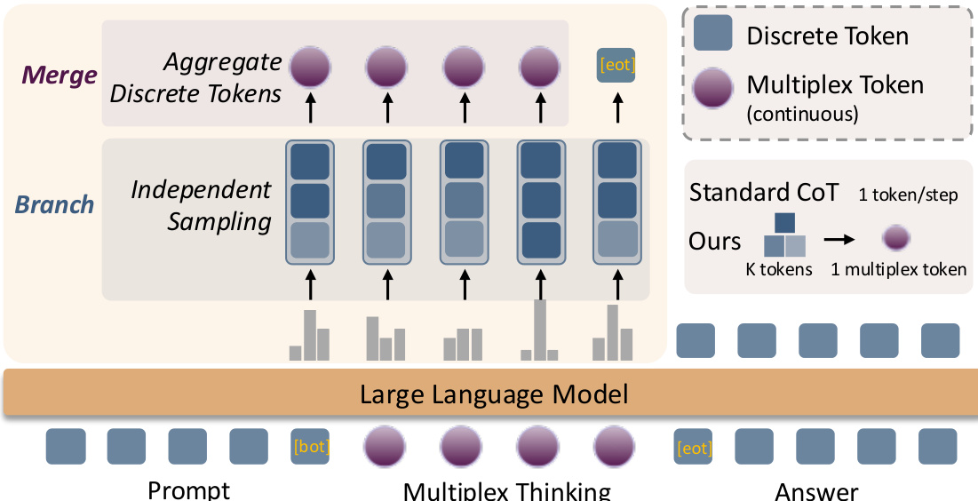 As shown in the figure below, the Branch phase involves sampling K discrete tokens at each step, which are then passed to the Merge phase. In the Merge phase, these discrete tokens are aggregated into a continuous multiplex token using a weighting scheme that can be either uniform averaging or reweighting based on the model's language model head probabilities. The resulting multiplex token is then fed into the large language model as input for the next reasoning step. This process continues until the model generates a stop token, at which point the final answer is produced. The framework is designed to be self-adaptive: when the model is confident, the multiplex token behaves like a standard discrete token, and when uncertain, it compactly represents multiple plausible next steps without increasing sequence length. This design allows for efficient optimization of reasoning trajectories using on-policy reinforcement learning, as the probability of generating a multiplex token can be factorized into the sum of the log-probabilities of the constituent discrete samples.