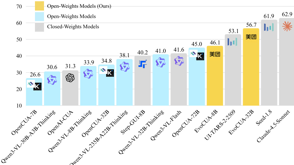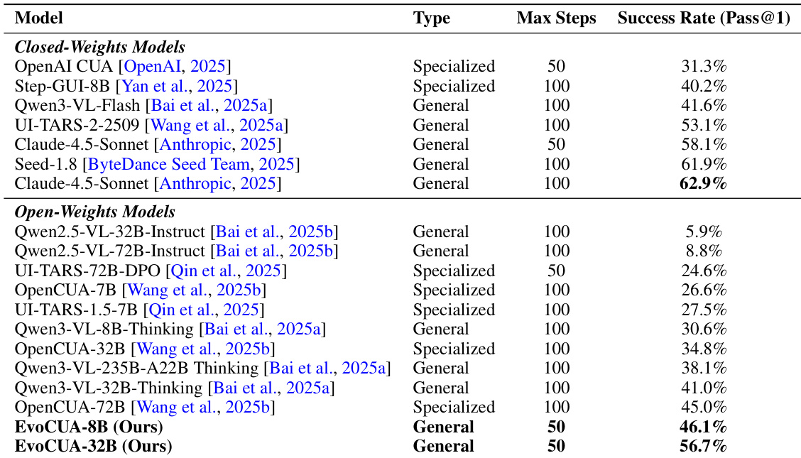- EvoCUA-32B achieves 56.7% success rate on OSWorld, top among open-weights models, surpassing OpenCUA-72B (45.0%) by +11.7% and outperforming closed-weights UI-TARS-2-2509 (53.1%) by +3.6% under 50-step constraint.
