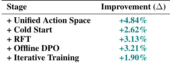 - Ablation studies confirm cumulative gains: unified action space (+4.84%), cold start (+2.62%), RFT (+3.13%), DPO (+3.21%), and iterative cycles (+1.90%) drive consistent improvement on Qwen3-VL-32B-Thinking.