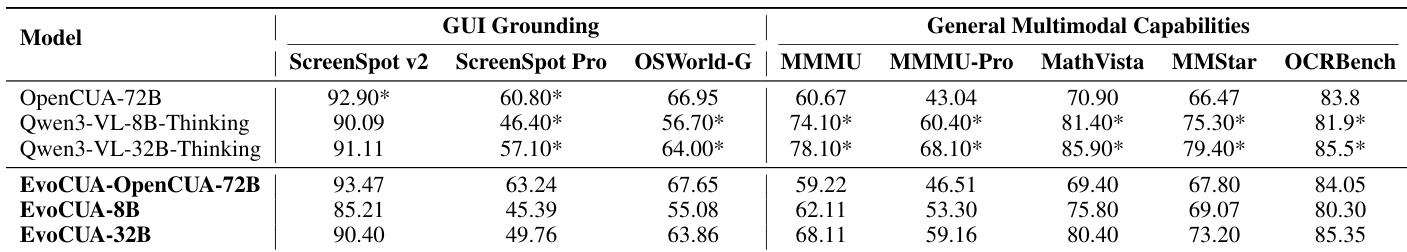 The authors evaluate EvoCUA's performance on offline grounding and general multimodal capabilities, showing that the EvoCUA-32B variant experiences a decline in specific metrics like ScreenSpot-Pro and MMMU compared to the Qwen3-VL-32B-Thinking baseline, primarily due to a mismatch in data distribution and patterns. In contrast, EvoCUA-72B maintains or slightly improves performance across benchmarks, confirming the effectiveness of the training strategy when the base model's data distribution is aligned.