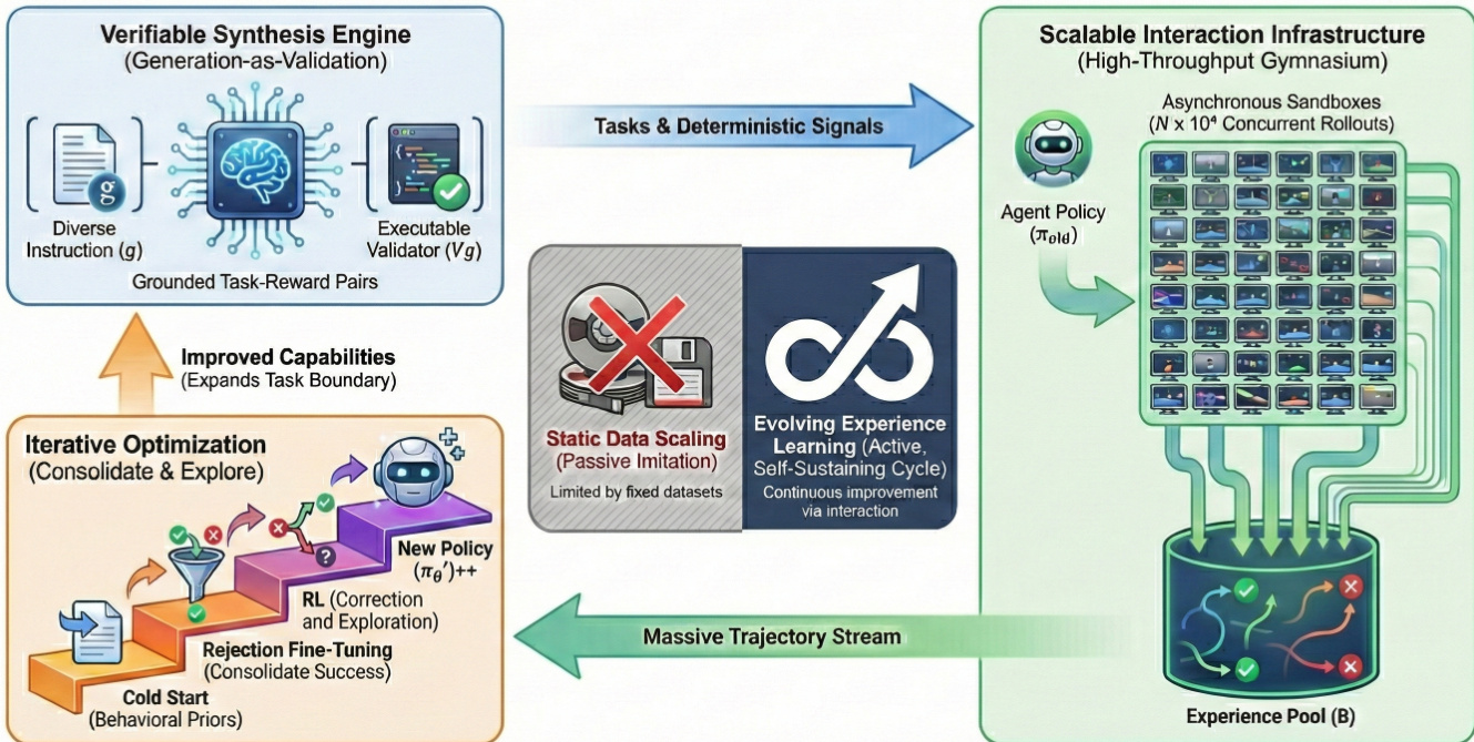 - The system features a verifiable synthesis engine that generates executable tasks with built-in validators and a scalable infrastructure enabling tens of thousands of asynchronous sandbox rollouts, ensuring grounded, high-throughput interaction data.