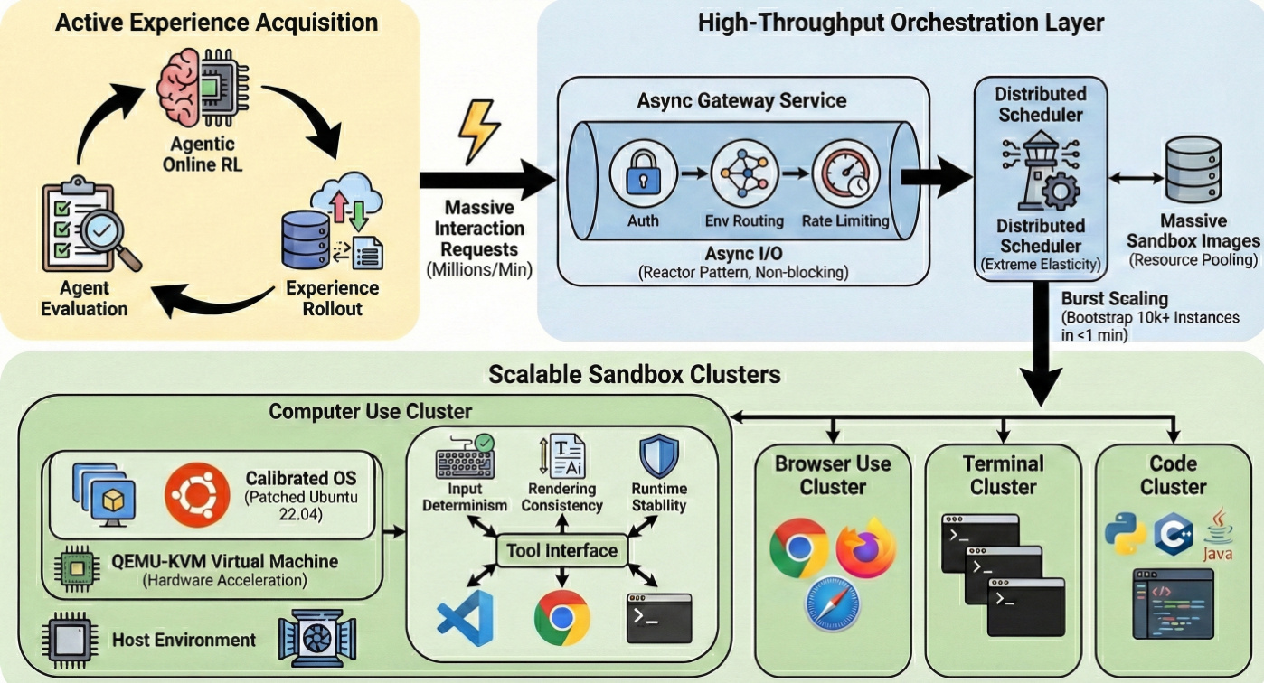 The Scalable Interaction Infrastructure, depicted in the third figure, is the backbone of the system, enabling the massive-scale generation of interaction data. This infrastructure is built on a microservices architecture designed for high throughput and low latency. It consists of an asynchronous gateway service, based on the reactor pattern, which handles millions of interaction requests per minute with non-blocking I/O, ensuring that long-running environment executions do not block critical routing logic. This gateway routes requests to a distributed scheduler, which manages the lifecycle of massive sandbox images. The scheduler leverages distributed sharding and resource pooling to achieve high-efficiency node scheduling and supports burst scaling, capable of bootstrapping tens of thousands of sandbox instances within one minute. This rapid instantiation ensures that the environment scaling strictly matches the training demand of on-policy reinforcement learning. The infrastructure is further supported by a hybrid virtualization architecture, where QEMU-KVM virtual machines are encapsulated within Docker containers, providing both security and near-native performance. The environment is calibrated with a customized OS image based on Ubuntu 22.04, which includes specific kernel and userspace patches to ensure input determinism, rendering consistency, and runtime stability.
