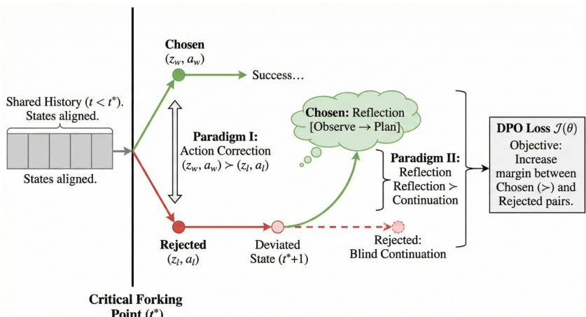 The Evolving Experience Learning paradigm, illustrated in the fourth figure, is the core optimization engine that transforms raw interaction data into a refined policy. This process is structured into three progressive stages. The first is a supervised cold start, which establishes behavioral priors by training on a small set of high-quality trajectories. The second stage is Rejection Sampling Fine-Tuning (RFT), which consolidates successful experiences by generating high-quality trajectories through dynamic compute budgeting and denoising them to maximize the signal-to-noise ratio. The final stage is reinforcement learning, which rectifies failures and explores complex dynamics. This is achieved through a Step-Level Direct Preference Optimization (DPO) strategy that targets critical forking points. Given a failed rollout and a successful reference, the system identifies the first timestamp where the agent's action diverges from the reference, despite the environmental states remaining functionally equivalent. This isolates the specific response that caused the agent to leave the optimal solution manifold. Two paradigms are then constructed: Paradigm I (Action Correction) replaces the rejected error with an optimal chosen response, and Paradigm II (Reflection) addresses the state immediately after the error by training the agent to halt and generate a reasoning chain that observes the unexpected screen state and formulates a remedial plan. The policy is optimized using a DPO loss function that maximizes the margin between effective and ineffective strategies.