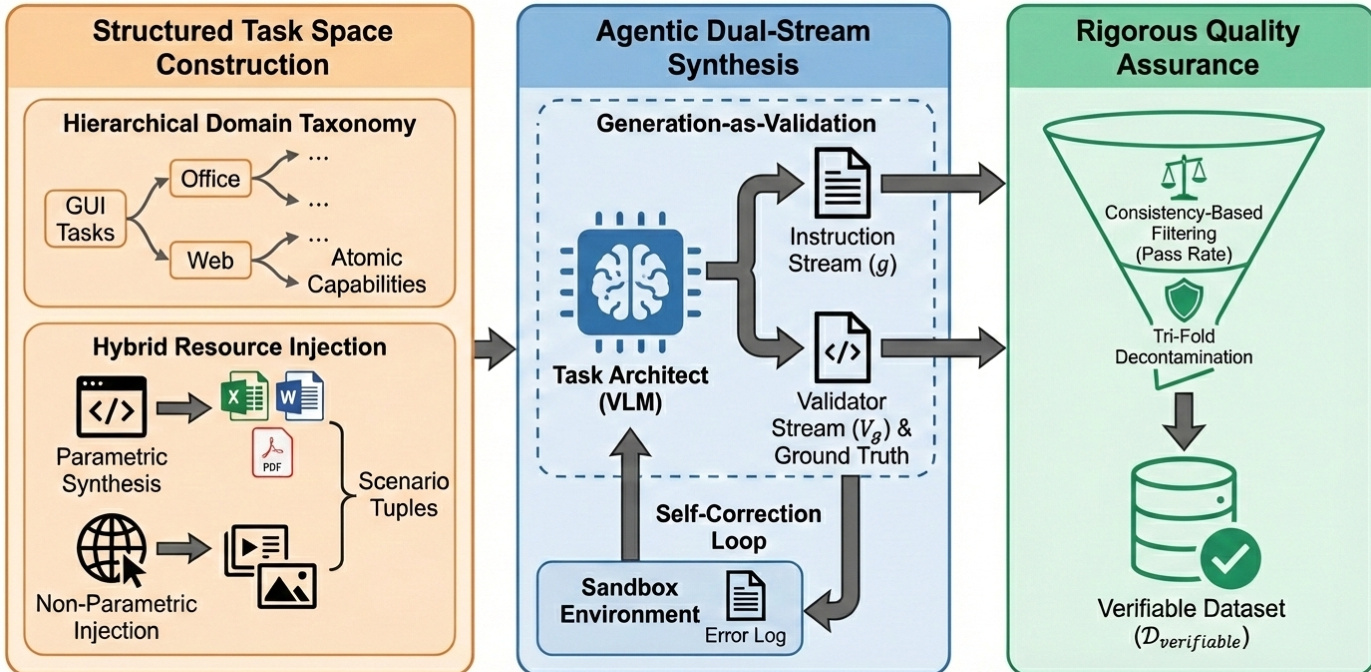 The Verifiable Synthesis Engine, detailed in the second figure, is responsible for generating task-reward pairs that are both semantically grounded and executable. This engine operates through a cascaded process involving structured task space construction, agentic dual-stream synthesis, and rigorous quality assurance. The structured task space is built upon a hierarchical domain taxonomy that categorizes tasks into GUI, Office, Web, and Atomic Capabilities, enabling systematic task generation. This is augmented by hybrid resource injection, which combines parametric synthesis (e.g., code snippets) with non-parametric injection (e.g., real-world documents and images) to create diverse scenario tuples. The core synthesis process is an agentic workflow where a foundation Vision-Language Model (VLM) acts as a task architect, simultaneously generating a natural language instruction (g) and a corresponding executable validator (Vg). This dual-stream generation is validated through a closed-loop feedback mechanism, where the generated code is executed in a sandbox environment, and the results are used to refine the output. This "generation-as-validation" paradigm ensures that the reward signal is derived from a strict verification of the final state, bypassing the ambiguity of semantic matching.