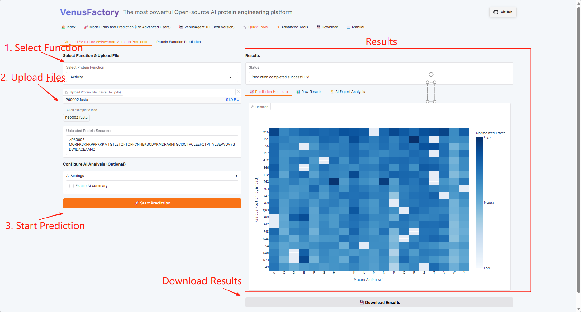 - Outils rapides : version facile à utiliser, prend en charge la prédiction de mutation à échantillon zéro (évolution dirigée) et la prédiction supervisée (prédiction de fonction ou de propriété).