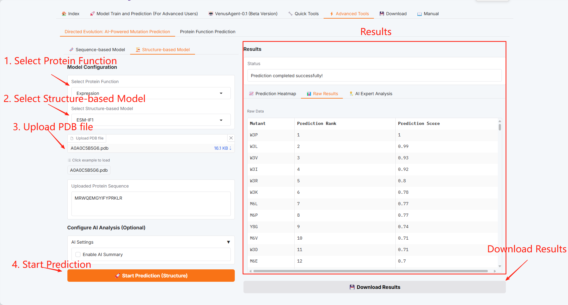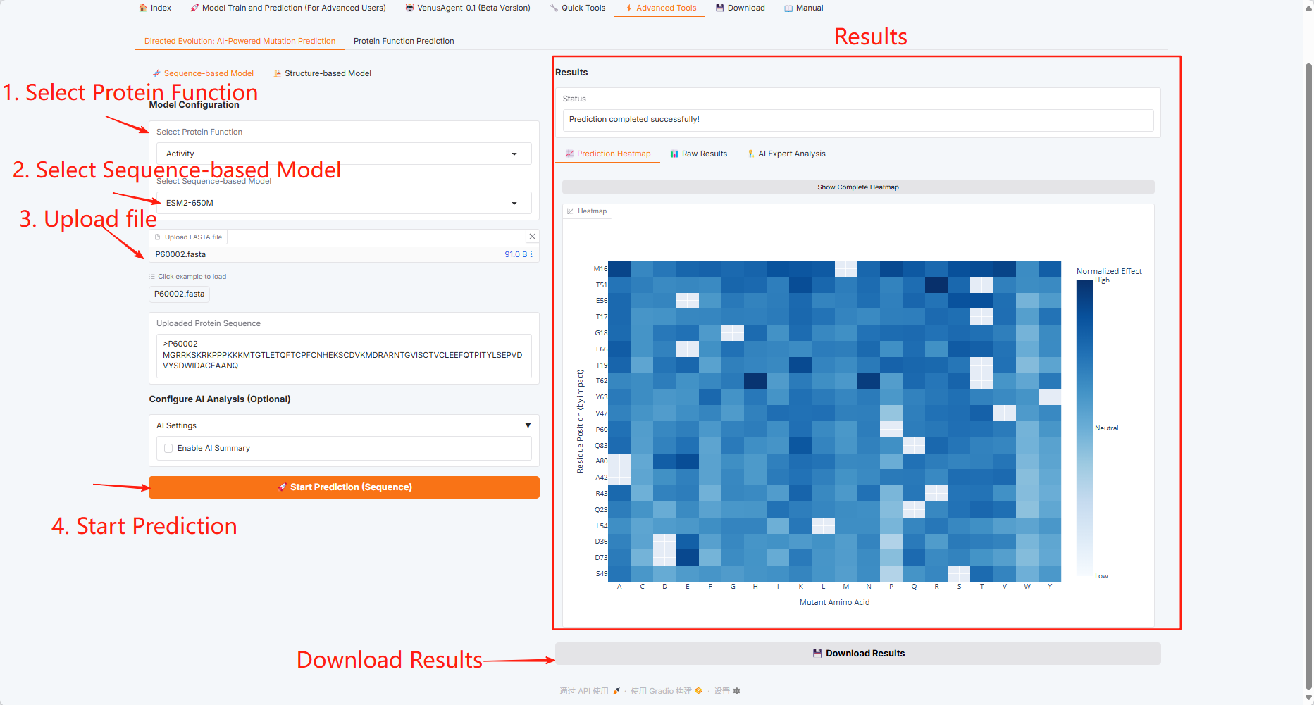 - Outils avancés : version personnalisée avancée, prenant en charge la prédiction de mutation à échantillon zéro (évolution dirigée) et la prédiction supervisée (prédiction de fonction ou de propriété).