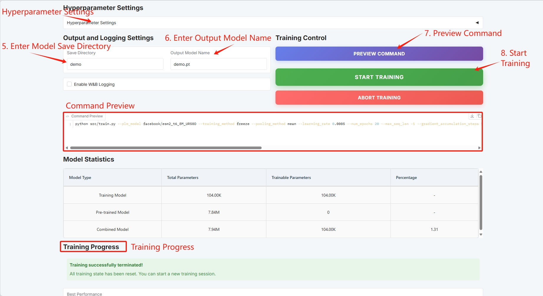 Définissez le chemin pour enregistrer le modèle formé et sélectionnez le modèle de langage protéique.