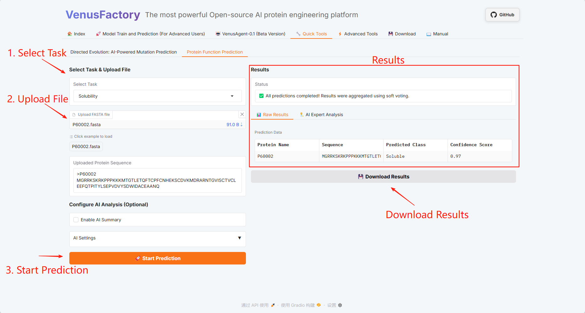 Cliquez sur le module « Outils rapides », qui comprend deux fonctions : Évolution dirigée : prédiction de mutation alimentée par l'IA et prédiction de la fonction des protéines.