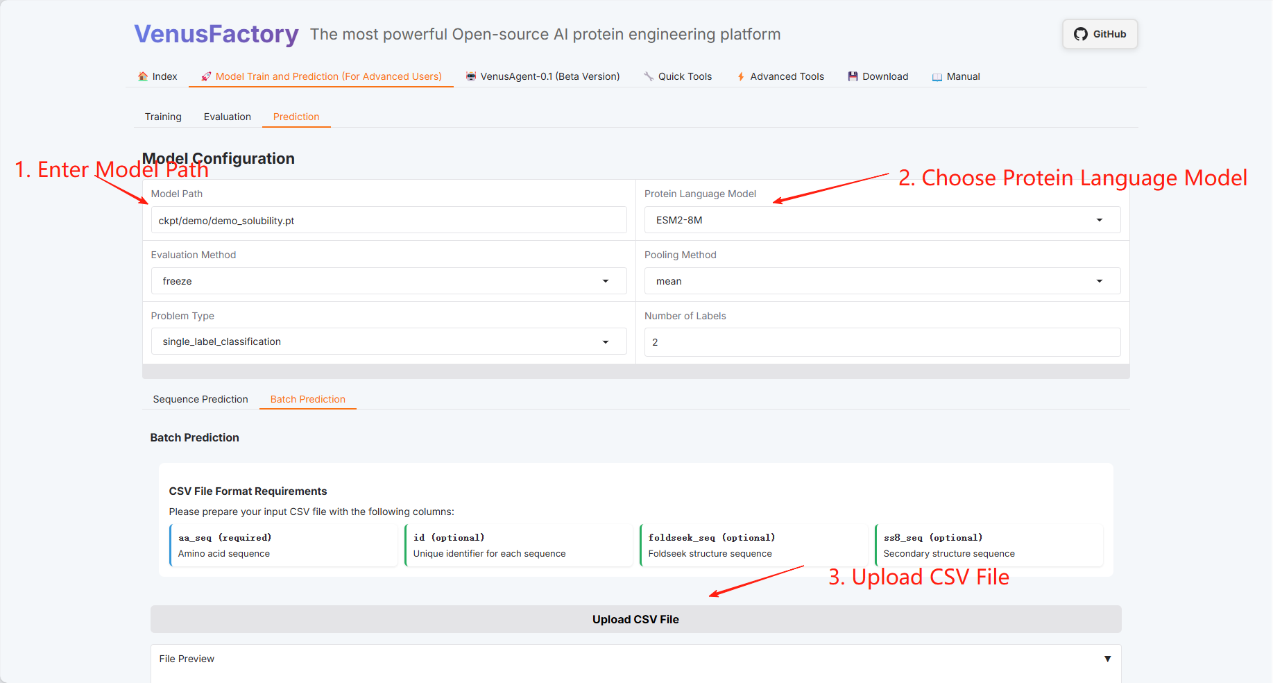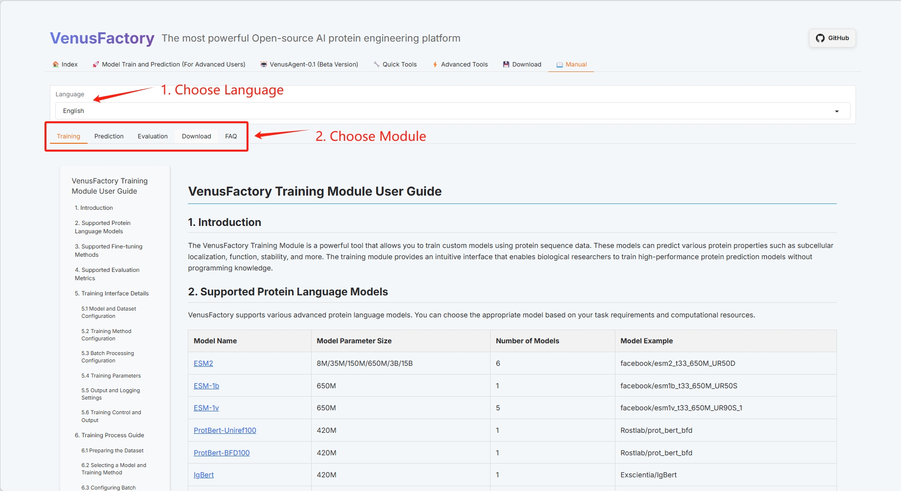 Le guide d'utilisation « Manuel » de VenusFactory comprend actuellement quatre modules : Formation, Évaluation, Prédiction et Téléchargement.