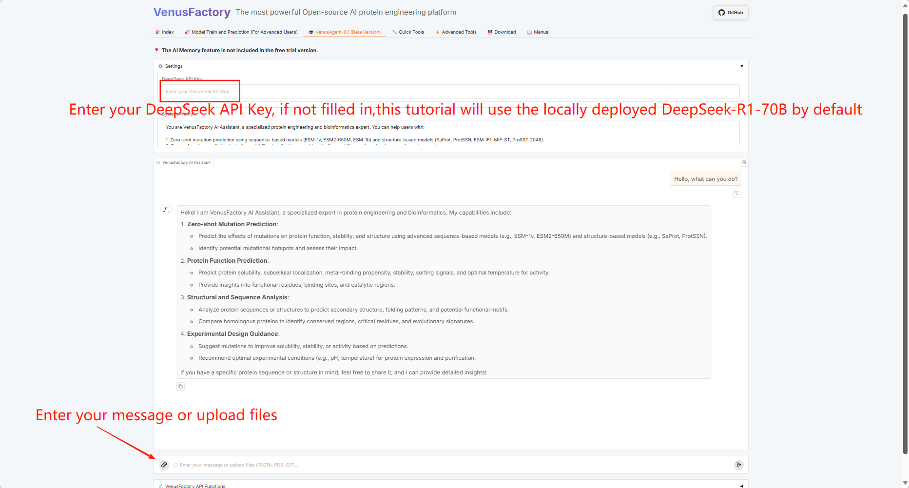 Si vous utilisez deux cartes graphiques RTX 4090, vous ne pouvez pas utiliser d'autres fonctions immédiatement (après 1 à 2 minutes) après avoir utilisé la fonction VenusAgent (il n'y a aucune restriction lors de l'utilisation de la clé API DeepSeek).