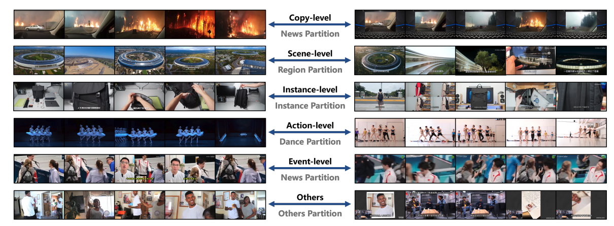 このデータセットには、ビリビリが提供する約53,000本の未編集動画、1,050件のマルチモーダルクエリ、そして84,000件のクエリと動画のマッチング関係が含まれており、ニュース、旅行、ダンスなど、様々な一般的な動画タイプを網羅しています。マッチング関係のレベルを明確に区別するために、データセットでは6つの視覚的対応レベル(コピー、イベント、シーン、インスタンス、アクションなど)を定義し、1対多の検索設定を採用しています。これにより、各クエリは関連コンテンツを含む複数の完全な動画に対応できます。クエリ形式には、長いテキストの説明、動画タグのヒント、マスクのヒントなどがあり、きめ細かな検索ニーズに対応できます。