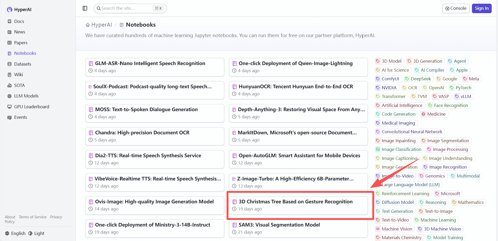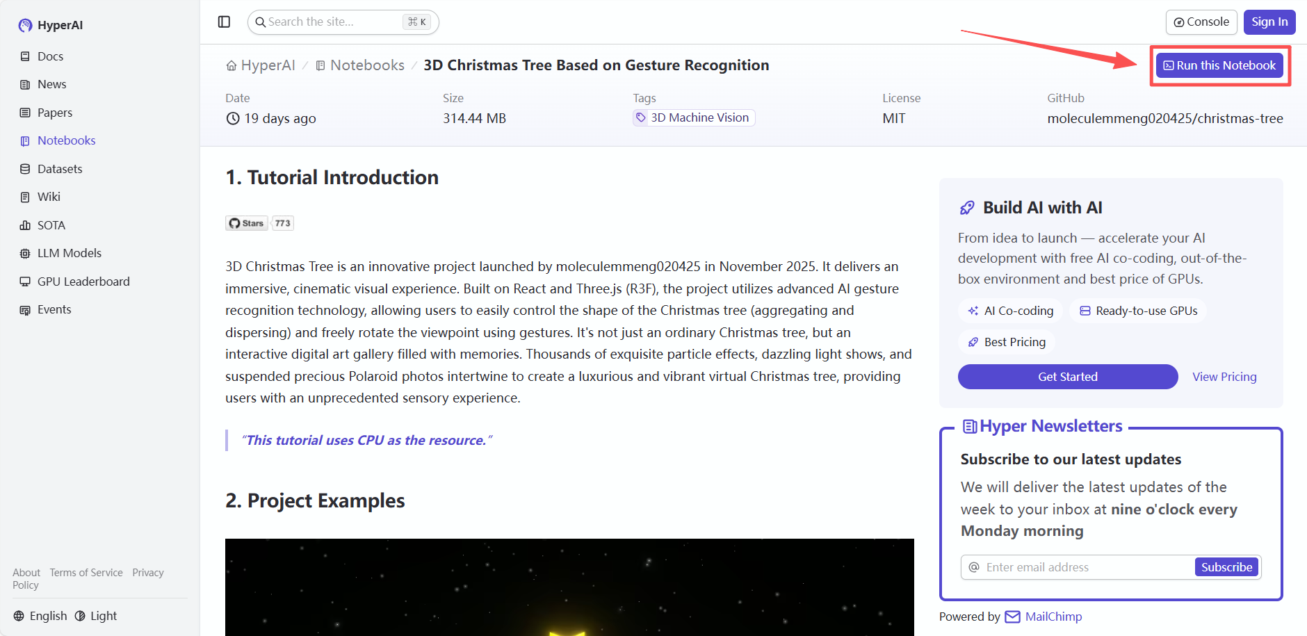 1. hyper.aiのホームページにアクセスしたら、「ジェスチャー認識に基づく3Dクリスマスツリー」を選択するか、「チュートリアル」ページに移動して選択します。「このチュートリアルをオンラインで実行」をクリックします。
