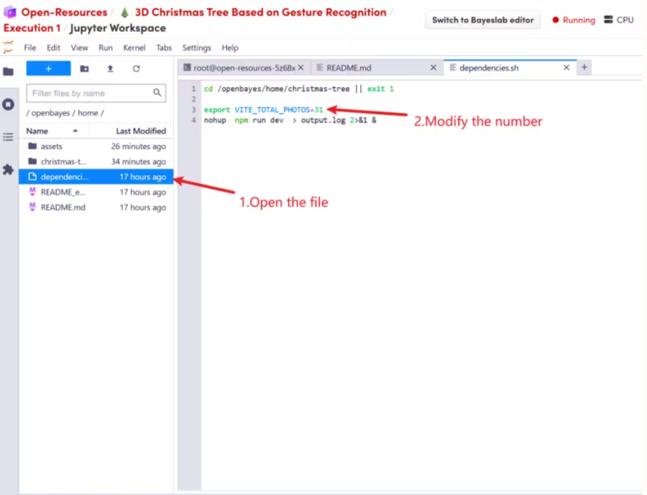 プロジェクトディレクトリ内のフォルダ「/openbayes/home/christmas-tree/public/photos/」を見つけます。トップ/カバー画像の名前は「top.jpg」とします(ツリーの頂上にある3Dの五芒星に表示されます)。幹の写真の名前は「1.jpg」、「2.jpg」、「3.jpg」などとします。推奨事項:正方形または4:3のアスペクト比の画像を使用し、ファイルサイズを小さく抑えてください(スムーズな再生を確保するため、1枚あたり500KB未満が理想的です)。