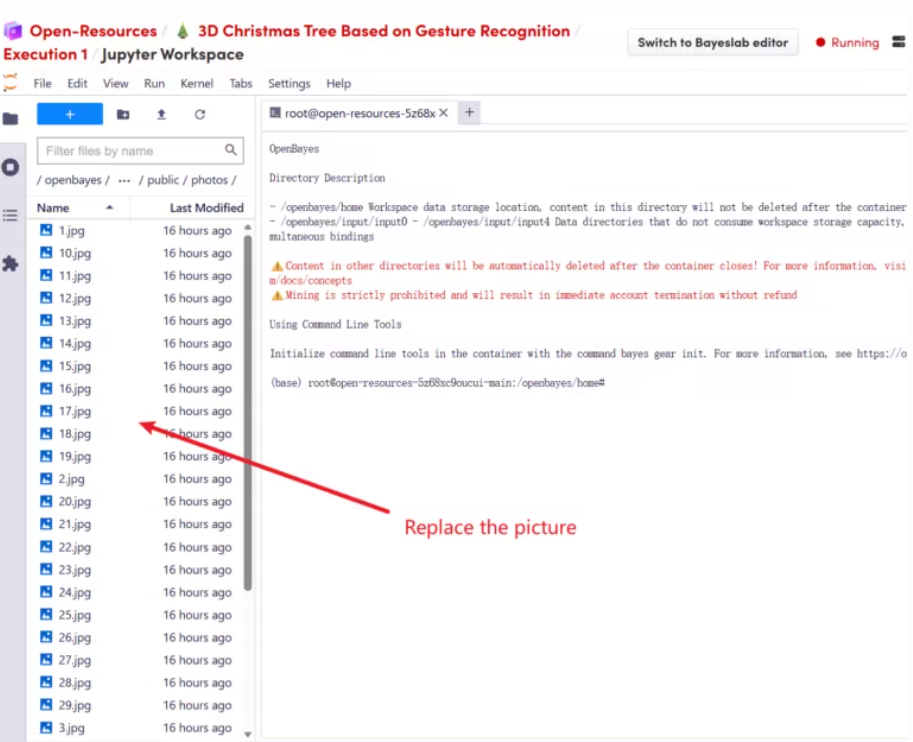 ご自身の写真を/openbayes/home/christmas-tree/public/photosフォルダにコピーし、既存の画像を上書きしてください。ファイル名の形式は変更しないでください(1.jpg、2.jpgなど)。