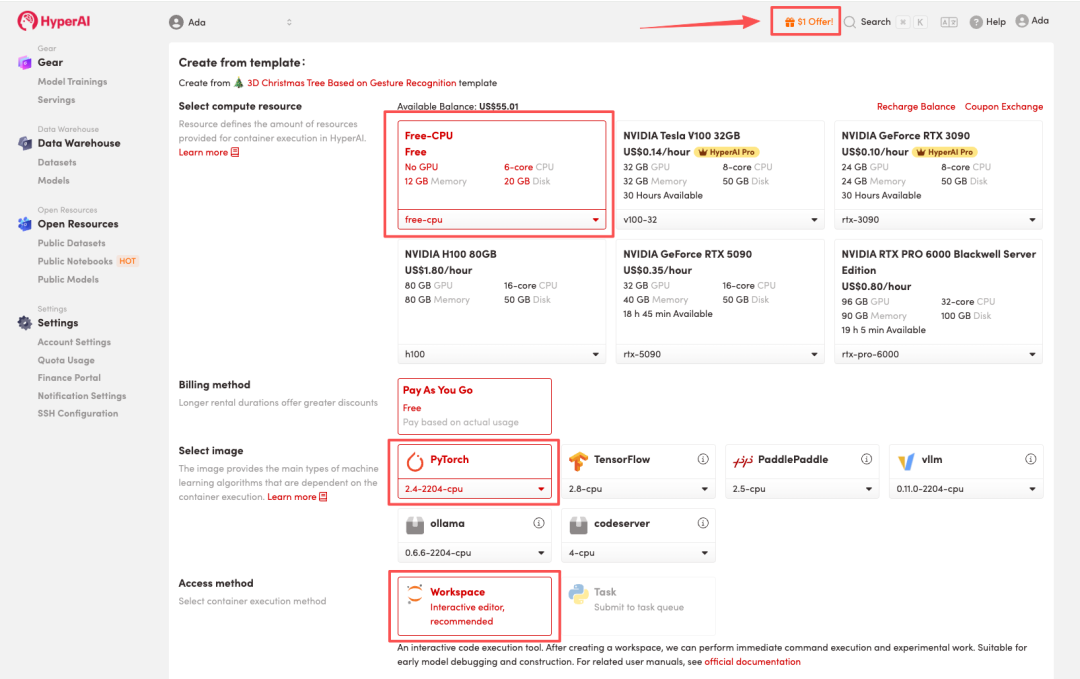 HyperAI は新規ユーザー向けに登録ボーナスを提供しています。わずか $1 で、RTX 5090 のコンピューティング パワー (元の価格は $7) を 5 時間利用でき、リソースは無期限に有効です。