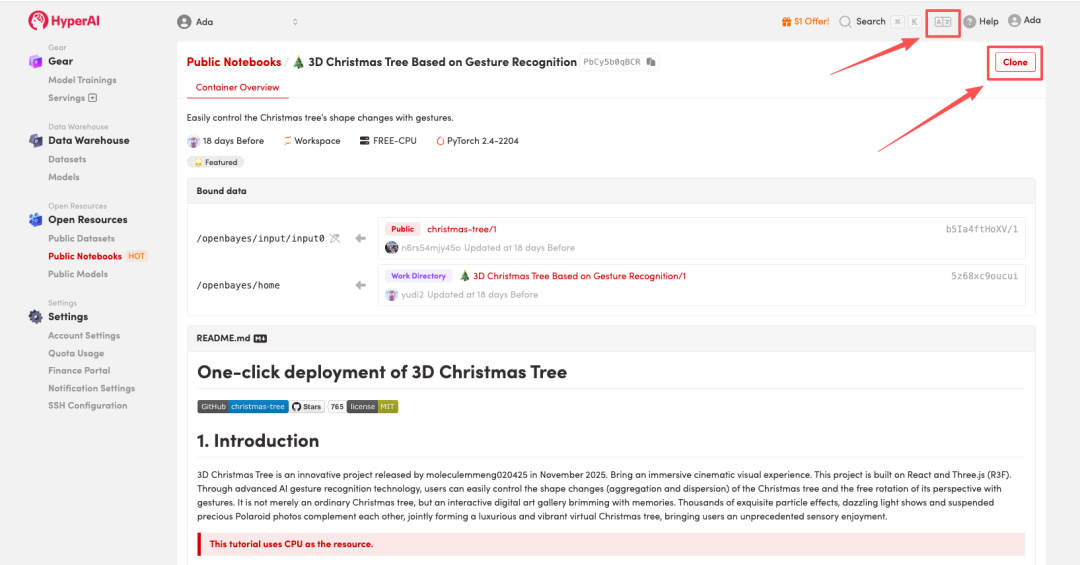 このチュートリアルはCPUのみを使用してオンラインで体験でき、HyperAIのコンピューティングプラットフォームはユーザーに永続的に無料のCPU使用時間を提供していることを付け加えておきます。詳細はこちらをクリック⬇️