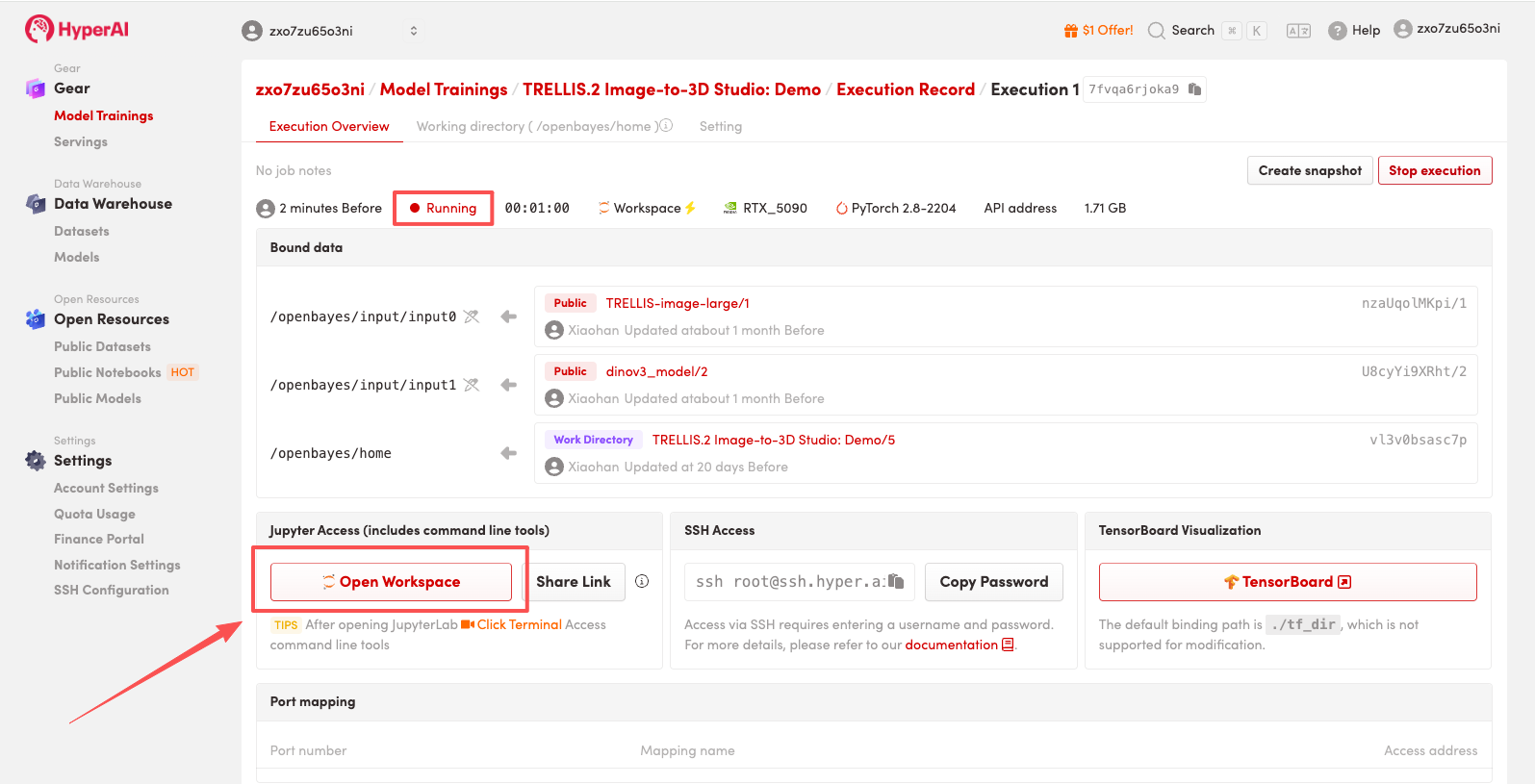 4. リソースが割り当てられるのを待ちます。ステータスが「実行中」に変わったら、「ワークスペースを開く」をクリックしてJupyterワークスペースに入ります。