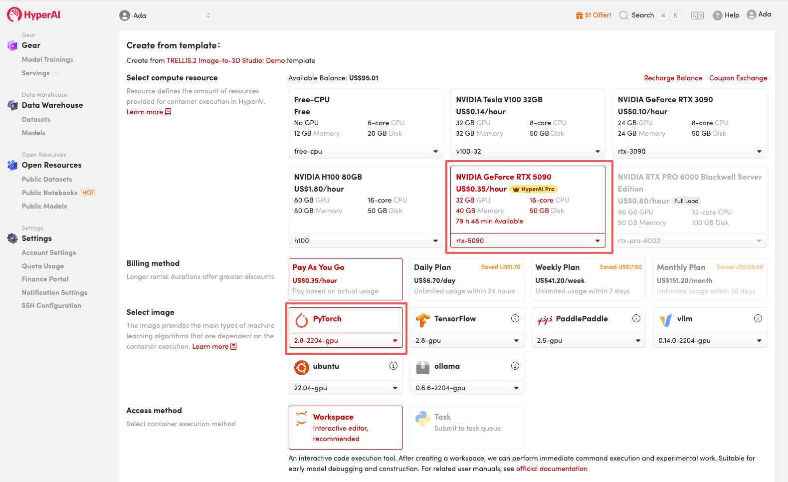 3. 「NVIDIA RTX 5090」と「PyTorch」のイメージを選択し、必要に応じて「Pay As You Go」または「Daily Plan/Weekly Plan/Monthly Plan」を選択し、「ジョブ実行を続行」をクリックします。