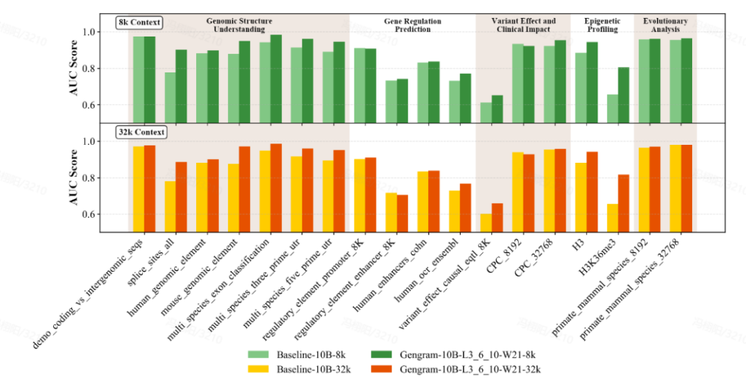 Gengramは、わずか約2,000万個のパラメータを持つ軽量プラグインです。数千億個のパラメータを持つベースモデルのごく一部を占めるに過ぎませんが、それでも大幅なパフォーマンス向上を実現します。同じ学習条件で、コンテキスト長を8kと32kとした場合…Gengram と統合されたモデルは、ほとんどのタスクにおいて統合されていないバージョンよりも優れたパフォーマンスを発揮しました。具体的な症状としてはスプライス サイト予測タスクの AUC スコアは 0.776 から 0.901 に改善され、TP3T は 16.11 増加しました。エピジェネティック予測タスク (H3K36me3) の AUC スコアは 0.656 から 0.804 に改善され、TP3T が 22.61 増加しました。