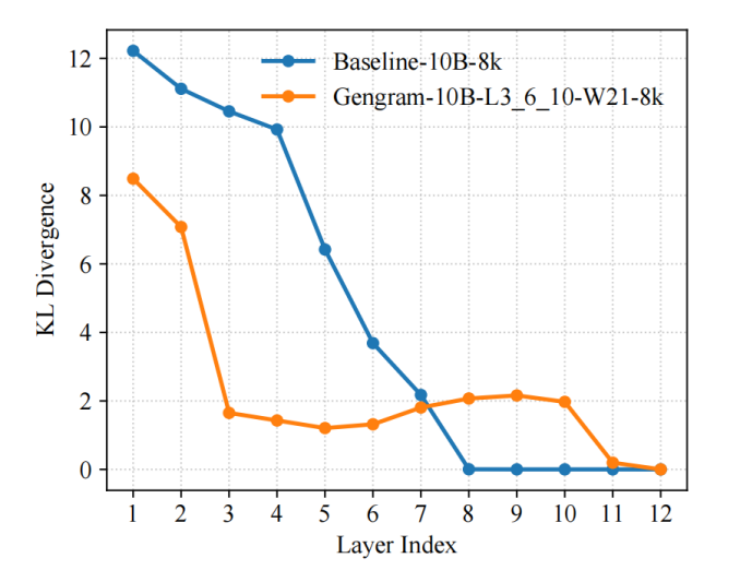 研究チームは、学習プロセスの表現診断指標としてKLダイバージェンスを導入し、LogitLens-KLを用いて各層の「予測準備度」を定量化し追跡しました。その結果、…Gengramsを導入することで、モデルは浅い層でより早い段階で安定した予測分布を形成できます。ベースラインモデルと比較して、層間 KL 値はより速く減少し、より早く低値範囲に入ります。これは、有効な監督信号が使用可能な表現に早く編成され、勾配の更新がより直接的になり、最適化パスがよりスムーズになり、最終的に収束速度が速くなり、トレーニング効率が高くなることを示しています。