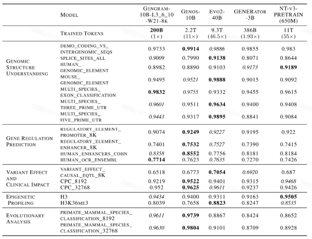 さらに、このパフォーマンス向上は、顕著な「データレバレッジ」効果を伴います。Evo2、NTv3、GENERATOR-3Bといった主流のDNAベースモデルとの横並び比較では、Gengrams を統合したモデルは、コアタスクで数倍から数十倍のトレーニングデータを持つ公開モデルに匹敵するために、ごく少量のトレーニングデータとより少ないアクティベーションパラメータのみを必要とします。高いデータトレーニング効率を実証します。