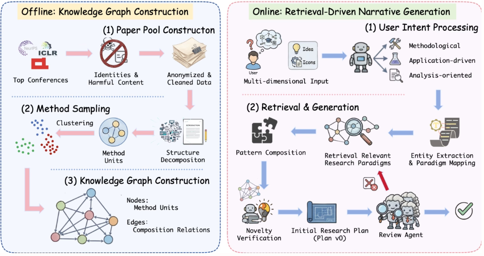AgentAlphaチームは、査読済み論文から方法論的知識グラフを構築することで、漠然とした研究アイデアを構造化された再利用可能なパターンに変換する事前計算フレームワーク「Idea2Story」を提案しました。これにより、大規模言語モデルにおける文脈的制約や錯覚が軽減され、文献の実行時再処理を必要とせずに、効率的で斬新な科学的発見が可能になります。
