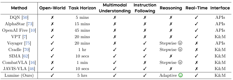 本論文では、複雑な3Dオープンワールド環境において、複雑なタスクを何時間もリアルタイムで実行できる、初のオープンソース汎用知能エージェント開発スキームであるLumineを提案する。Lumineは人間のようなインタラクションパラダイムを採用し、視覚言語モデルを通じて、知覚、推論、行動をエンドツーエンドで統合する。生のピクセル入力を毎秒5フレームの頻度で処理し、毎秒30フレームの正確なキーボードとマウス操作を生成し、必要な場合にのみ推論モジュールを動的に呼び出す。