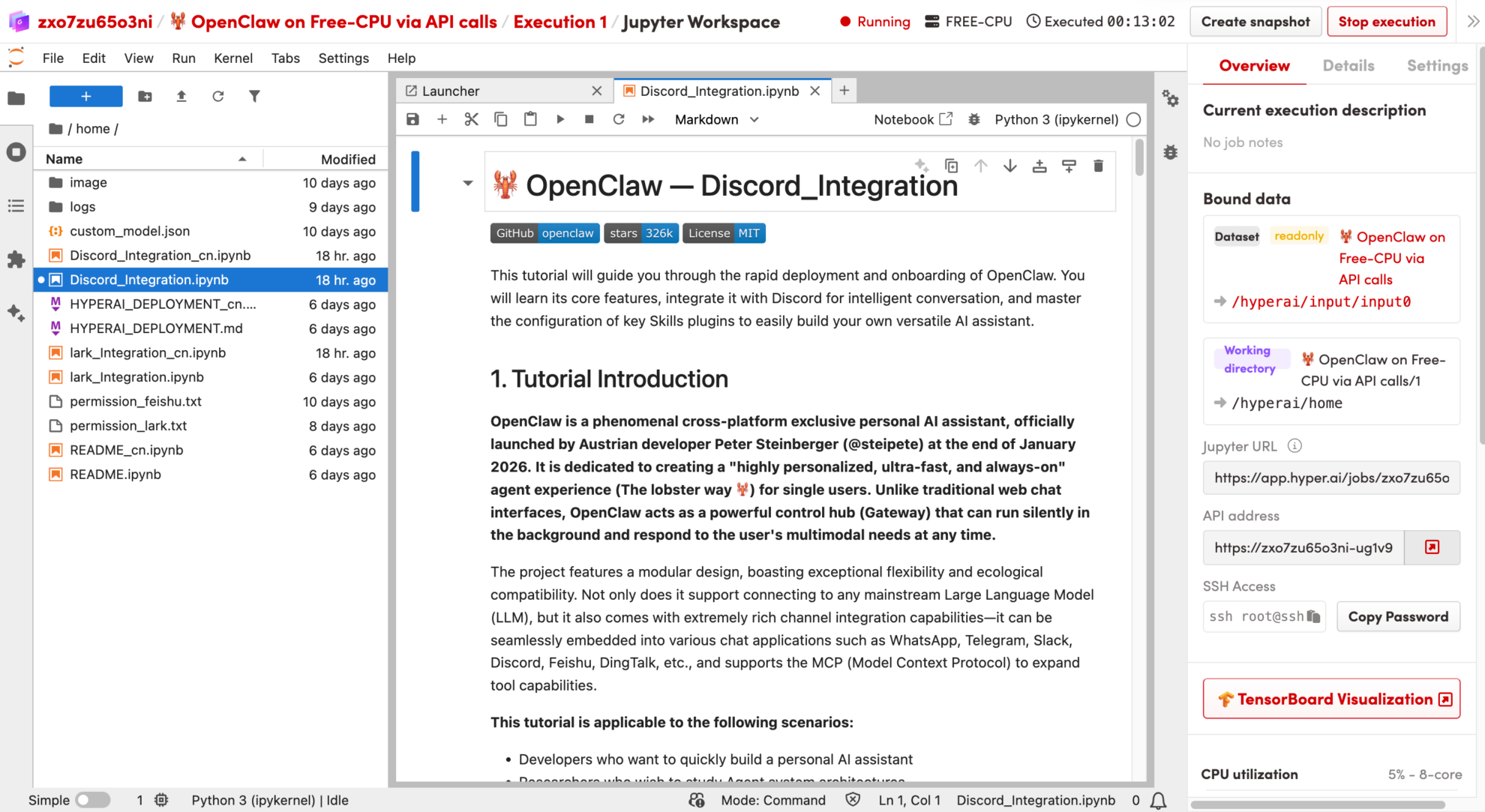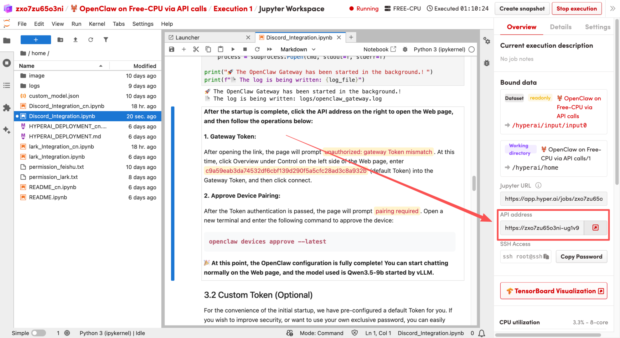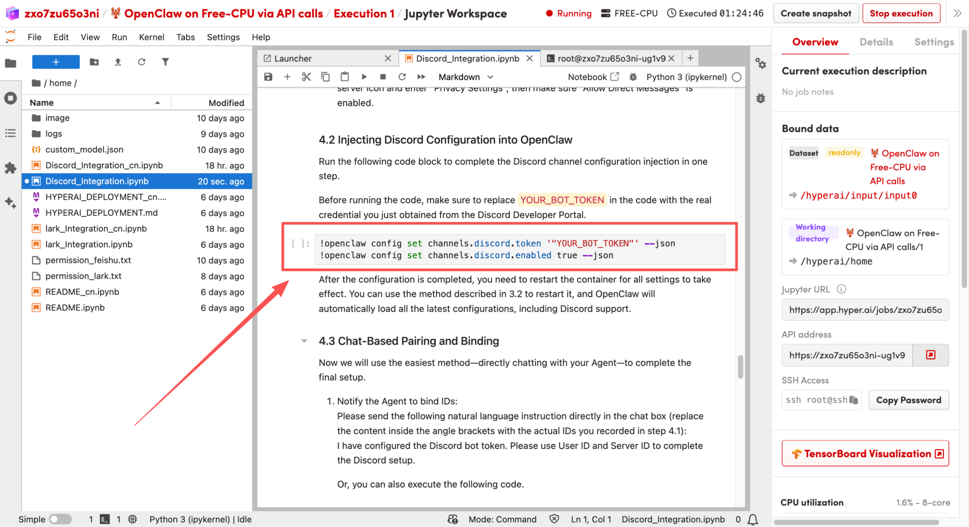 このチュートリアルでは、「🦞 OpenClaw: フリーCPUを使用してAPI呼び出しを実行する」を例として使用します。このドキュメントでは、OpenClawをHyperAIプラットフォームにデプロイし、Discordと統合する方法について詳しく説明します。