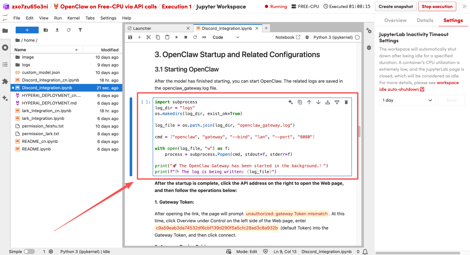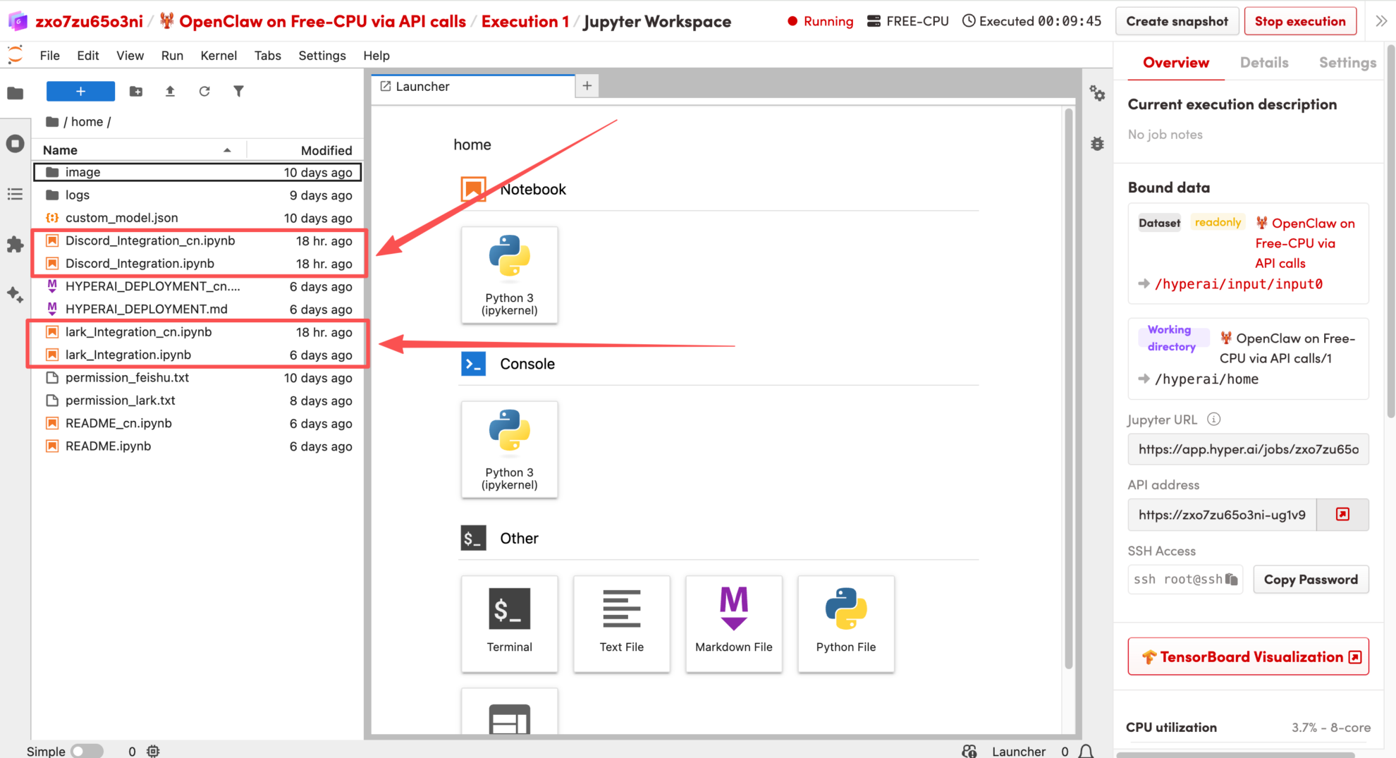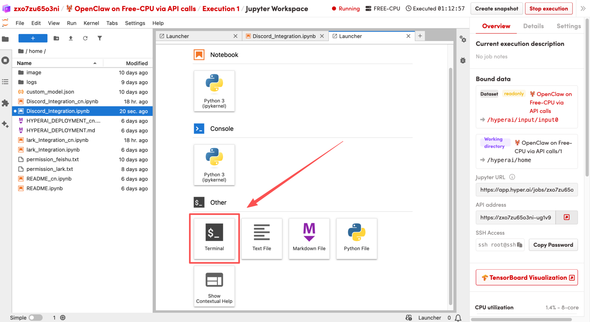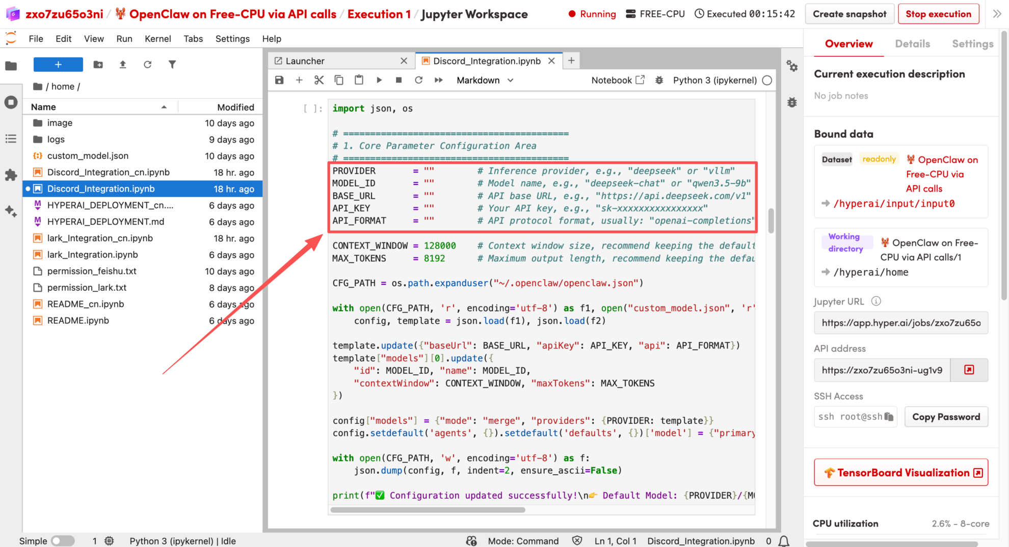 このチュートリアルでは、「🦞 OpenClaw: フリーCPUを使用してAPI呼び出しを実行する」を例として使用します。このドキュメントでは、OpenClawをHyperAIプラットフォームにデプロイし、Discordと統合する方法について詳しく説明します。