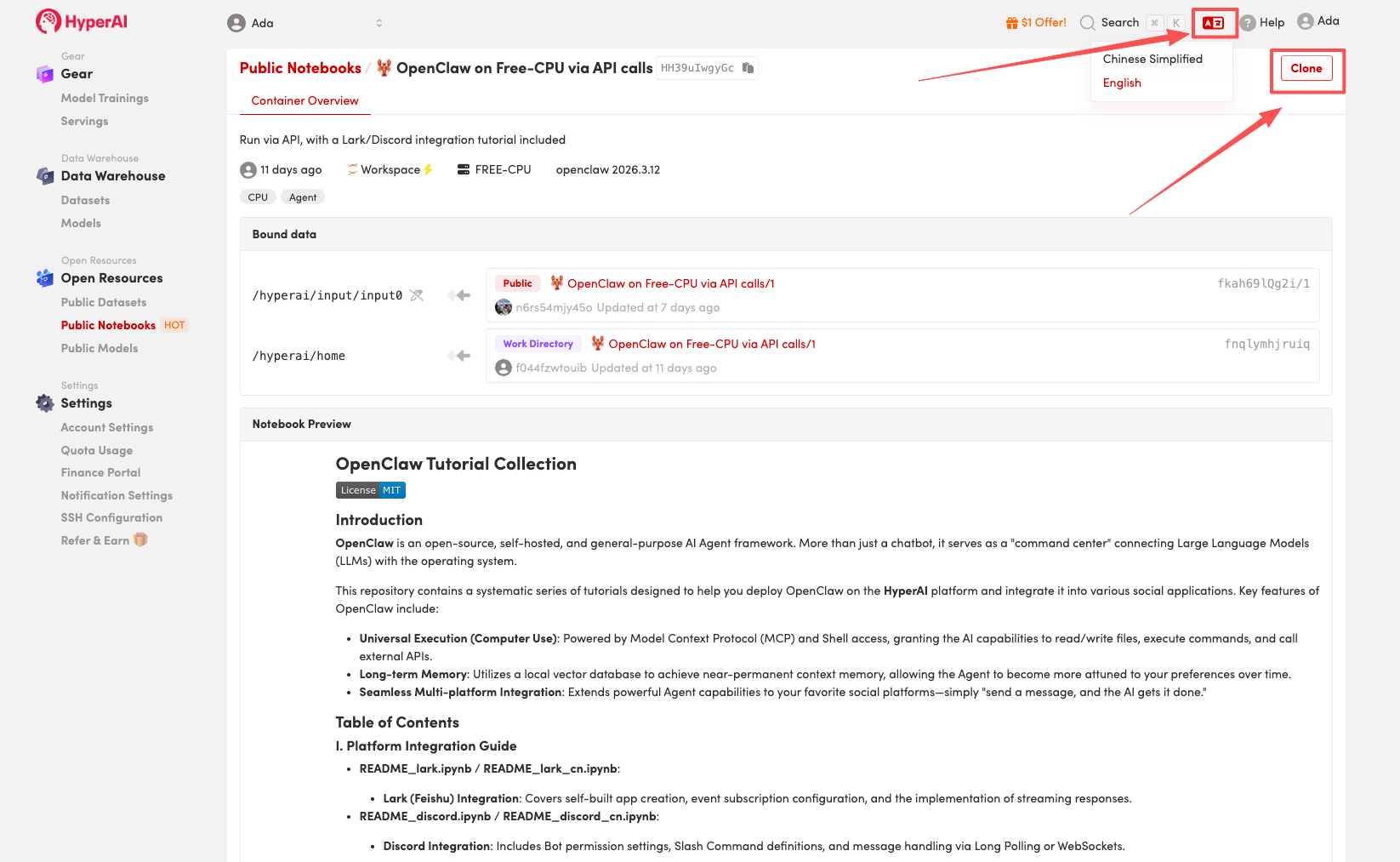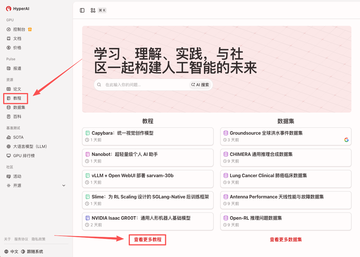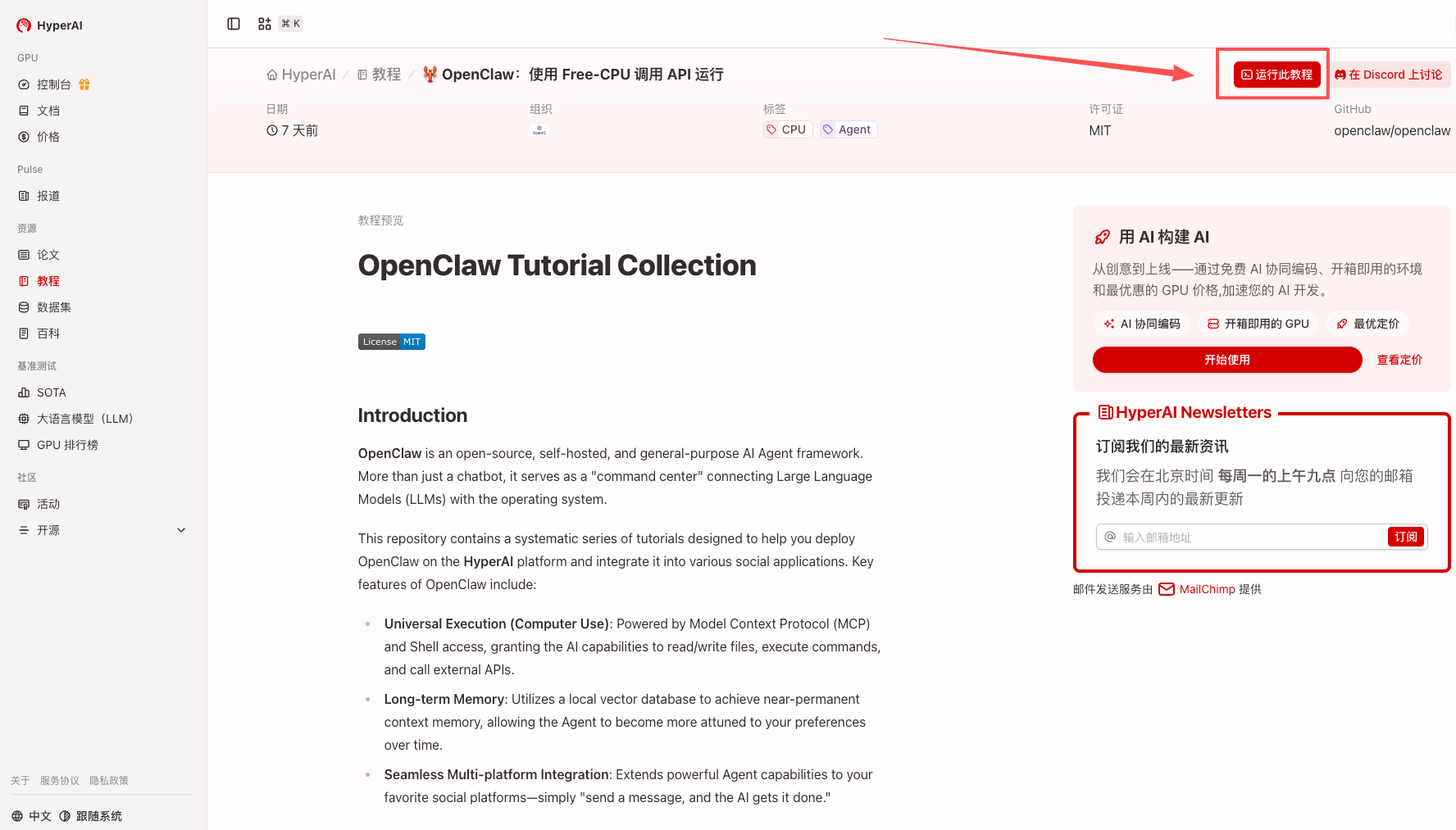1. hyper.ai のホームページにアクセスしたら、「チュートリアル」ページを選択するか、「その他のチュートリアルを表示」をクリックし、「🦞 OpenClaw: Free-CPU API で実行」を選択して、「このチュートリアルをオンラインで実行」をクリックします。
