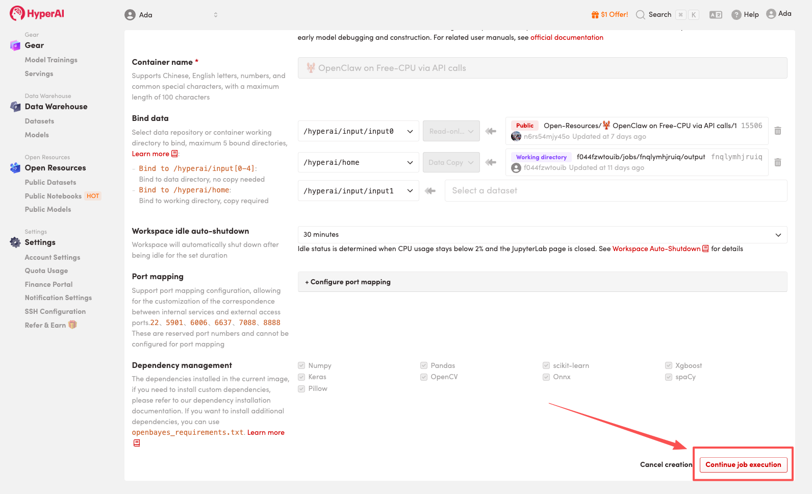 3. 「Free-CPU」と「openclaw」の画像を選択し、「ジョブの実行を続行」をクリックします。