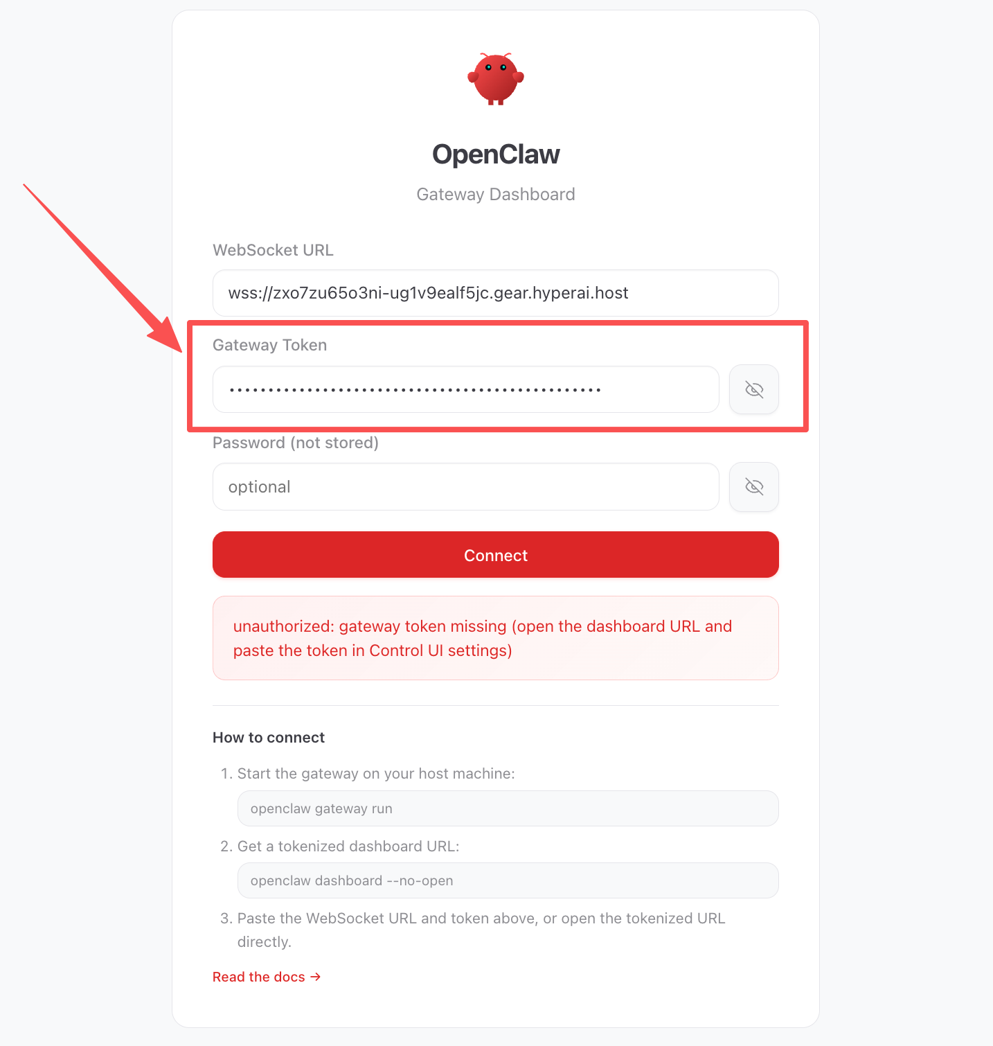この時点で、Web ページの左側にあるコントロールの下の概要をクリックし、ゲートウェイ トークンに c9a59eab3da74532df6cbf139d290f5a5cfc28ad3c8a932b (デフォルトのトークン) を入力して、接続をクリックします。