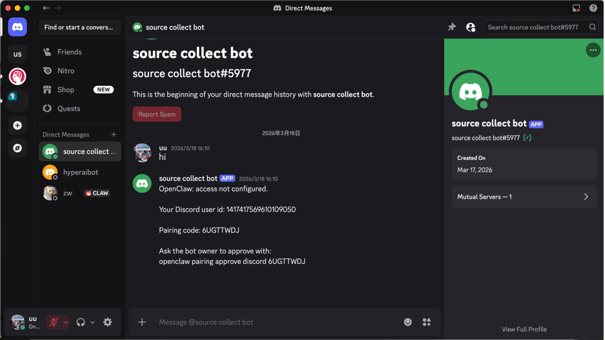 9. 次に、Discordクライアントに戻ってペアリングコードを受け取ります。左側のプライベートメッセージリストで先ほど追加したボットを見つけて、任意のメッセージを送信します。ボットは自動的に文字または数字で構成されるペアリングコードで返信します。その後、エージェントにコマンドを送信したチャットウィンドウに戻り、受信したペアリングコードを直接エージェントに送信します。「このDiscordペアリングコードを承認してください:<あなたのペアリングコード>」。