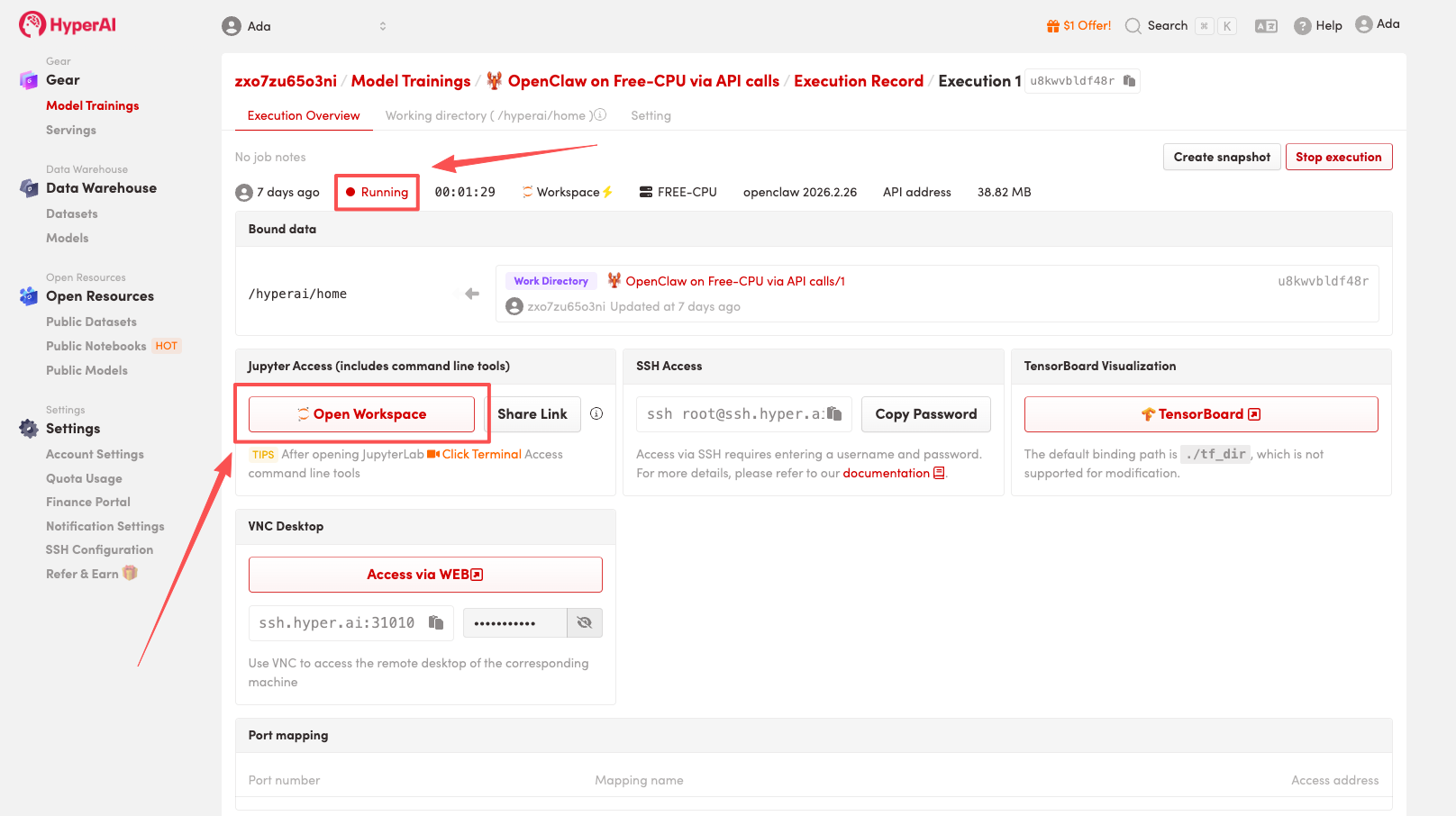 4. リソースが割り当てられるのを待ちます。ステータスが「実行中」に変わったら、「ワークスペースを開く」をクリックしてJupyterワークスペースに入ります。