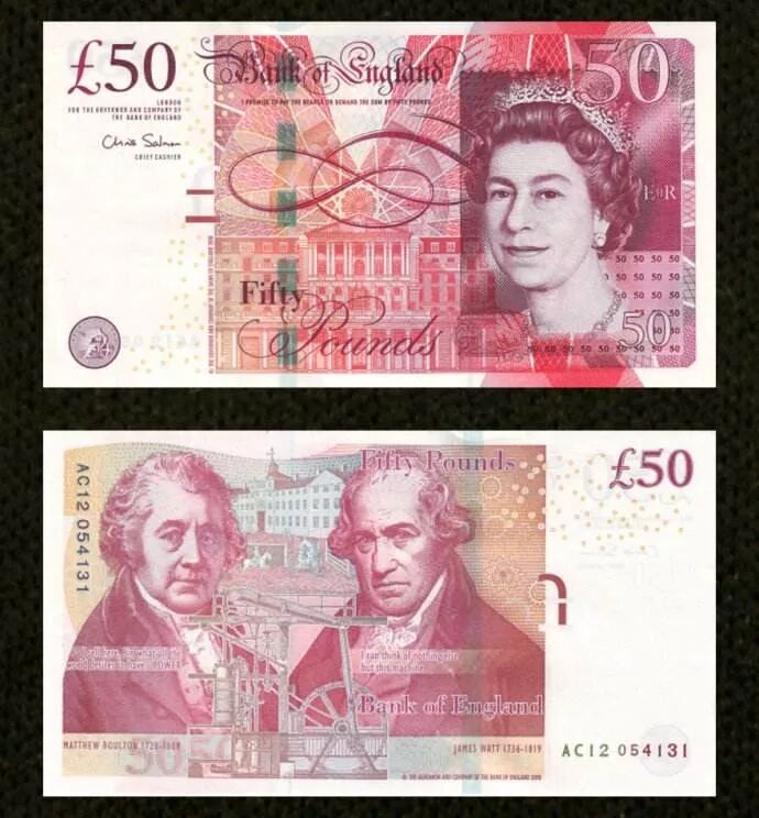 50ポンド紙幣は現在、英国の最高額紙幣で、表面にエリザベス2世の肖像、裏面に産業革命の先駆者ジェームズ・ワットとマシュー・ボールトンの肖像が描かれている。