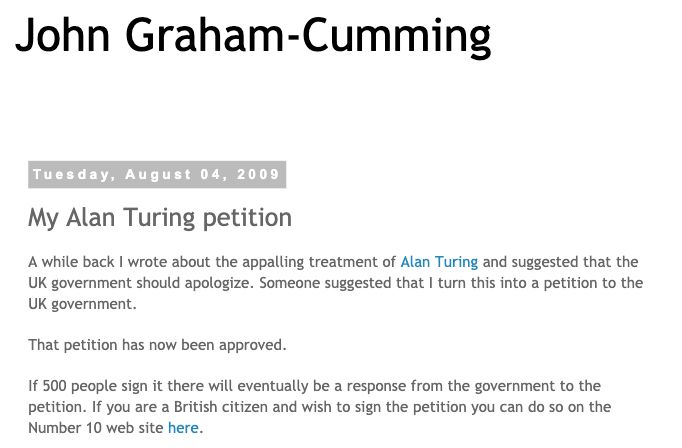 最初の謝罪:2009年、英国のコンピュータ科学者ジョン・グラハム・カミングはチューリングを更生させるキャンペーンを開始し、署名者の数は3万人を超え、英国のブラウン首相は正式な声明を出してチューリングに謝罪しなければならなかった。