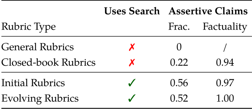 - Assessed the impact of Reinforcement Learning with Evolving Rubrics (RLER), finding that it improved rubric coverage by 8.2 points and boosted citation precision and recall on SQAv2 by 23.3 and 22.1 points, respectively.