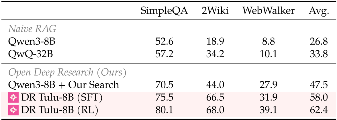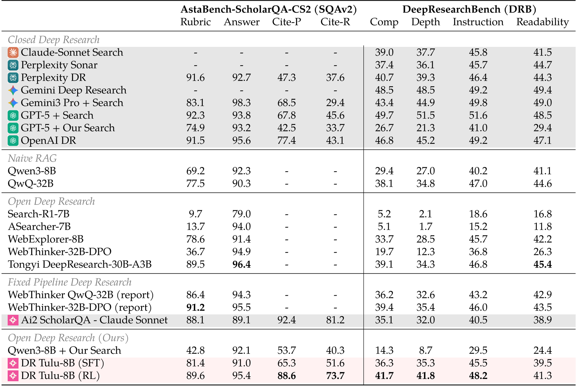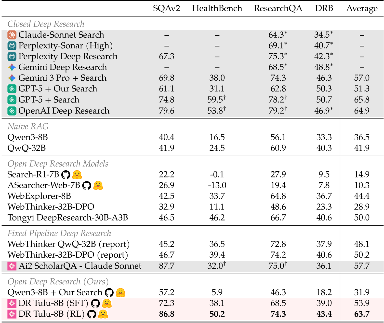 - Evaluated DR Tulu-8B on four long-form benchmarks (HealthBench, ResearchQA, SQAv2, DeepResearchBench), where it outperformed existing open deep research models by 13.7 to 53.4 points on average.